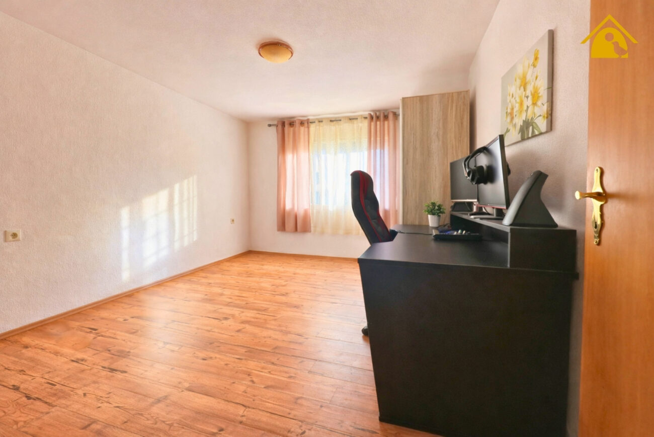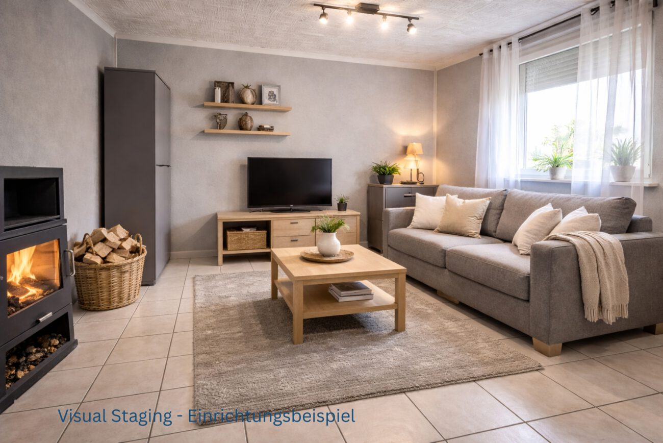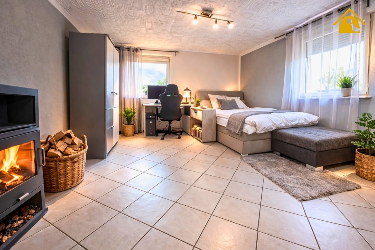 Das Wohnzimmer ist durch zwei große Fenster gut belichtet und wirkt freundlich und offen. Der vorhandene Kaminofen sorgt zusätzlich für eine angenehme Wohnatmosphäre und bietet gerade in der kälteren Jahreszeit eine behagliche Wärmequelle.