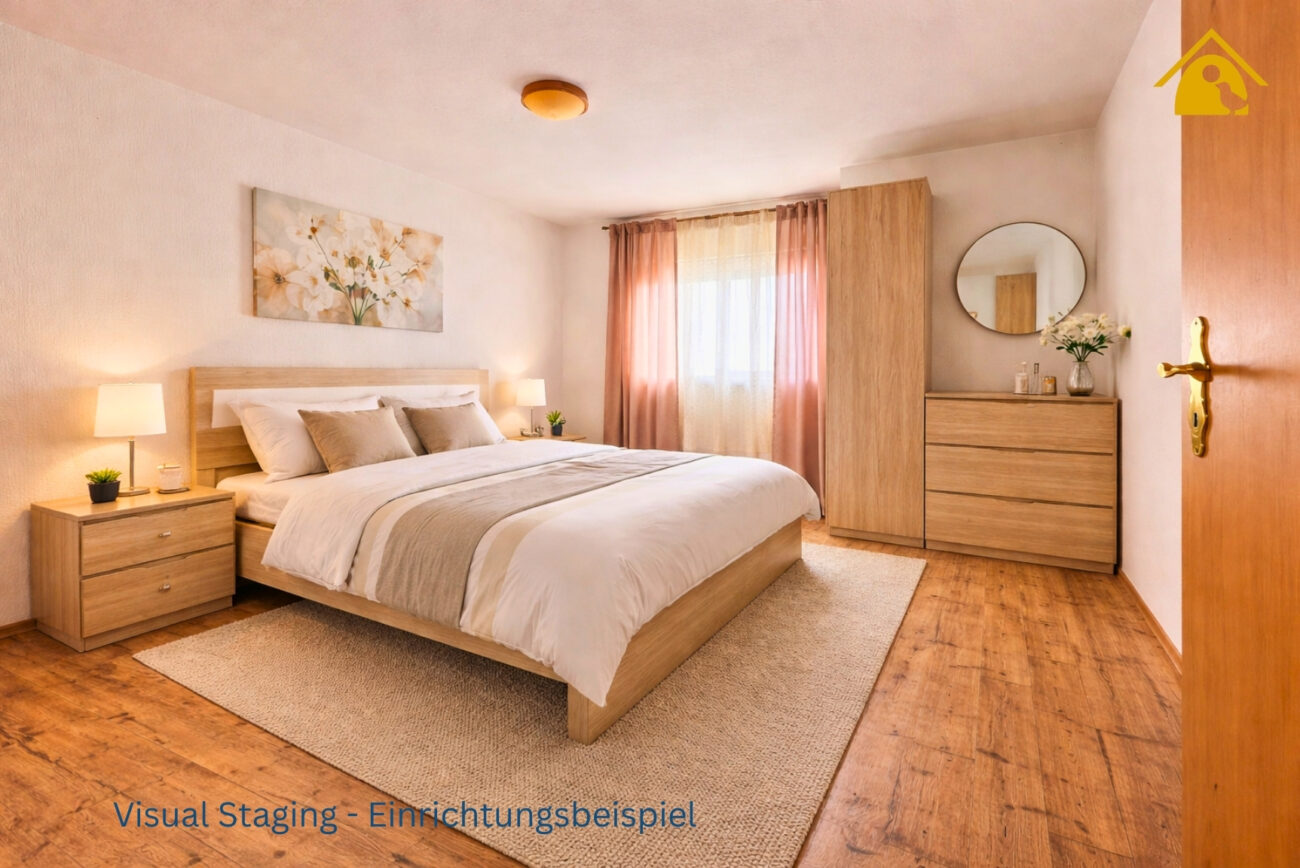 Das Schlafzimmer bietet ausreichend Platz für Bett und Schrank und lässt sich gut möblieren.