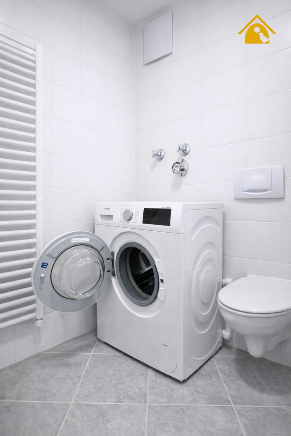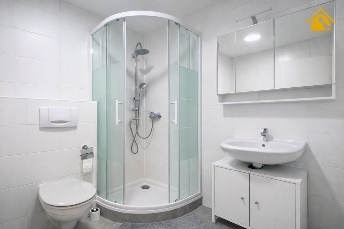 Das modernisierte Badezimmer präsentiert sich zeitgemäß mit Dusche, Waschbecken, WC sowie Waschmaschinenanschluss. Helle Fliesen und die Glasduschkabine sorgen für einen gepflegten Gesamteindruck.
