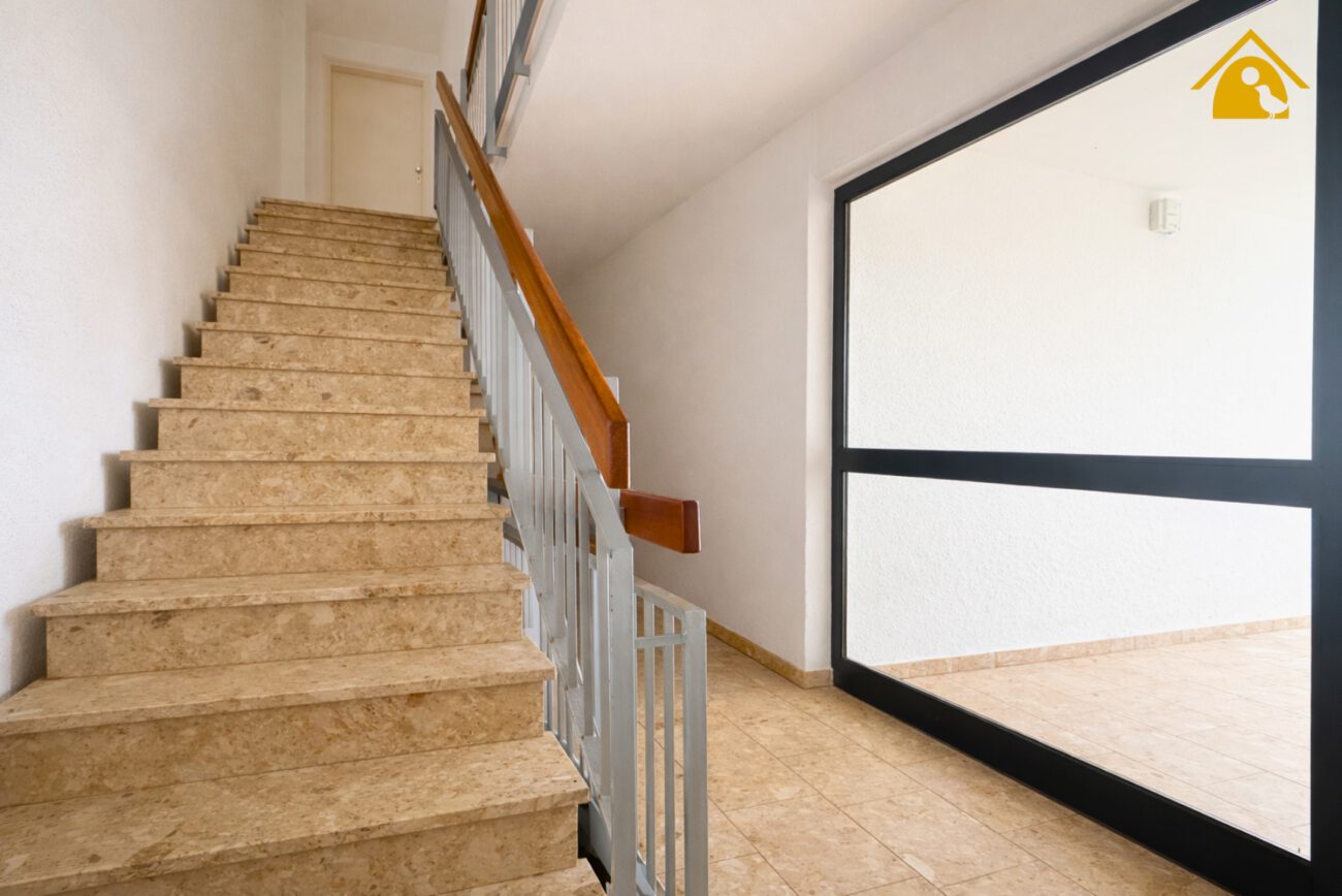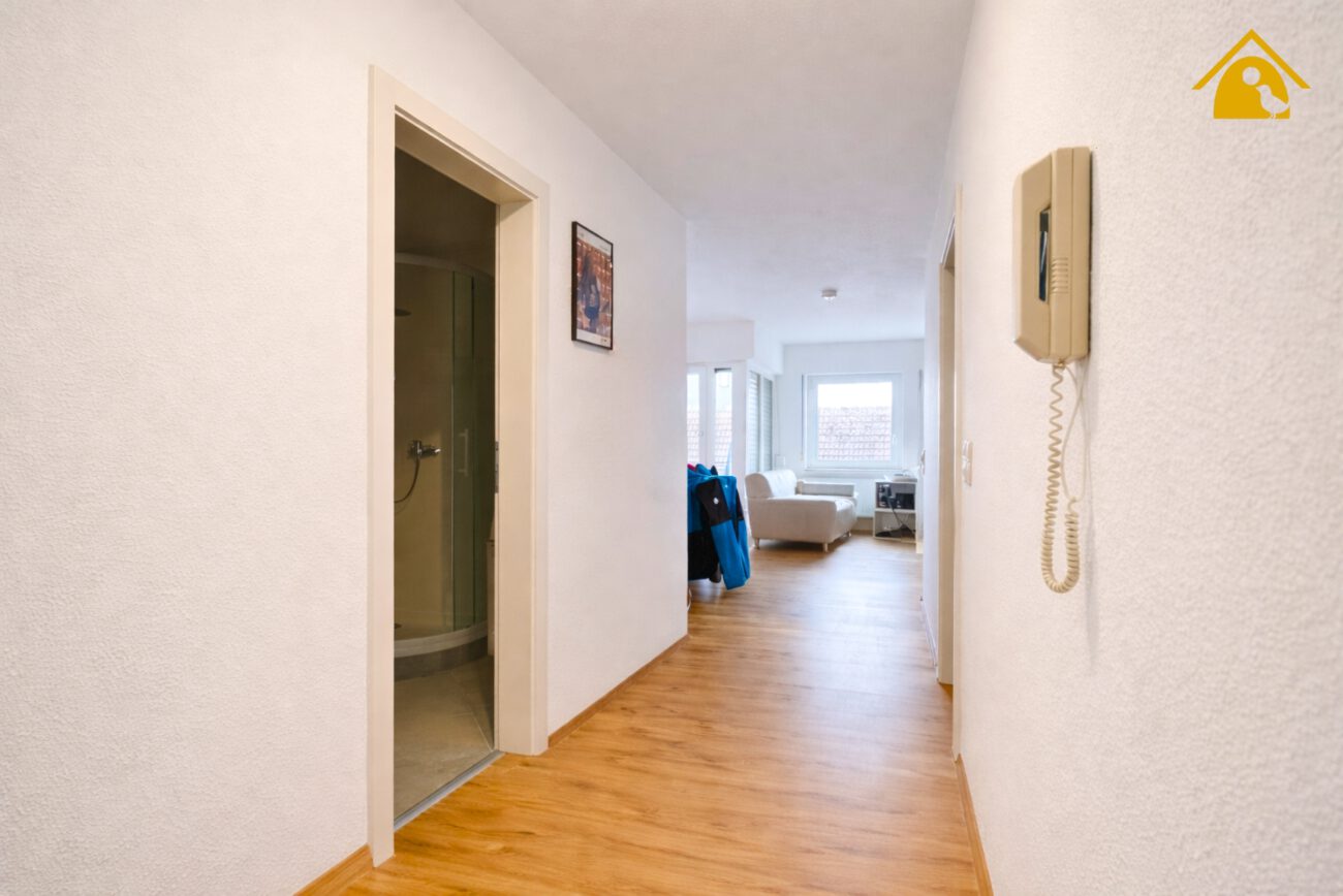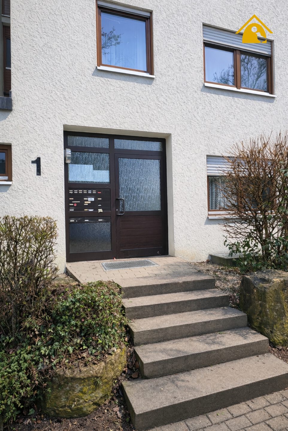 Der Hauseingangsbereich wirkt gepflegt und ordentlich. Eine großzügige Glastür trennt den Eingangsbereich vom Treppenhaus und sorgt gleichzeitig für viel Tageslicht. Das Treppenhaus selbst präsentiert sich funktional und solide mit massiven Natursteinstufen und stabilem Handlauf. Ein kleiner Fahrradraum befindet sich direkt nach dem Hauseingang auf der linken Seite.