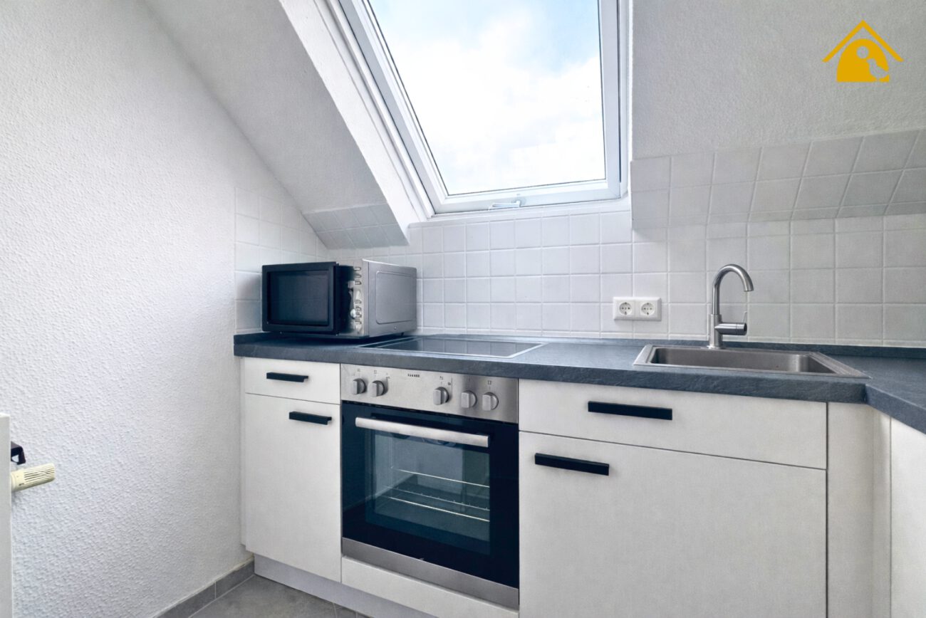 Das Schlafzimmer bietet trotz der Schrägen ausreichend Stellfläche für Bett und Schrank und wird über ein Dachflächenfenster freundlich belichtet. Die separate Küche ist funktional geschnitten und mit einer Einbauküche ausgestattet, die sich im Eigentum des Mieters befindet und nicht Bestandteil des Verkaufs ist.