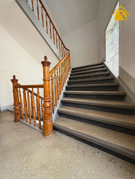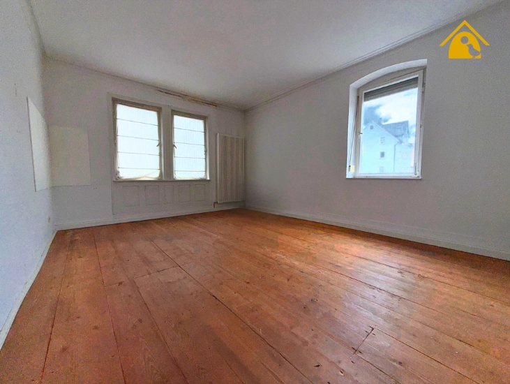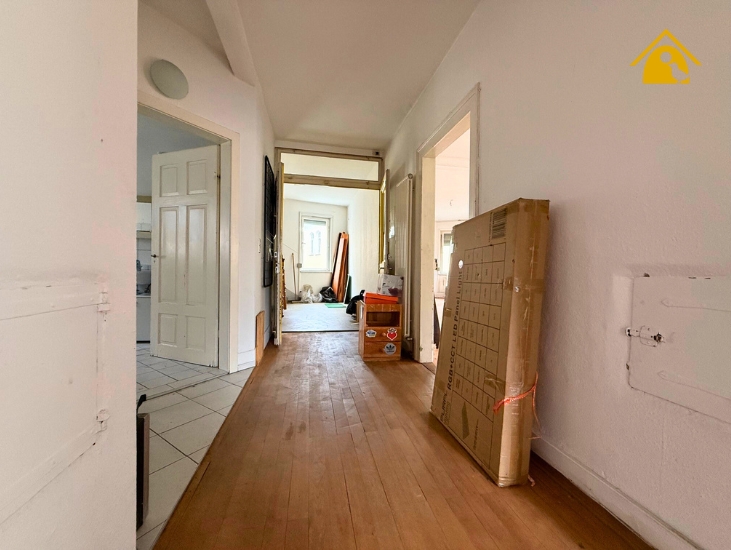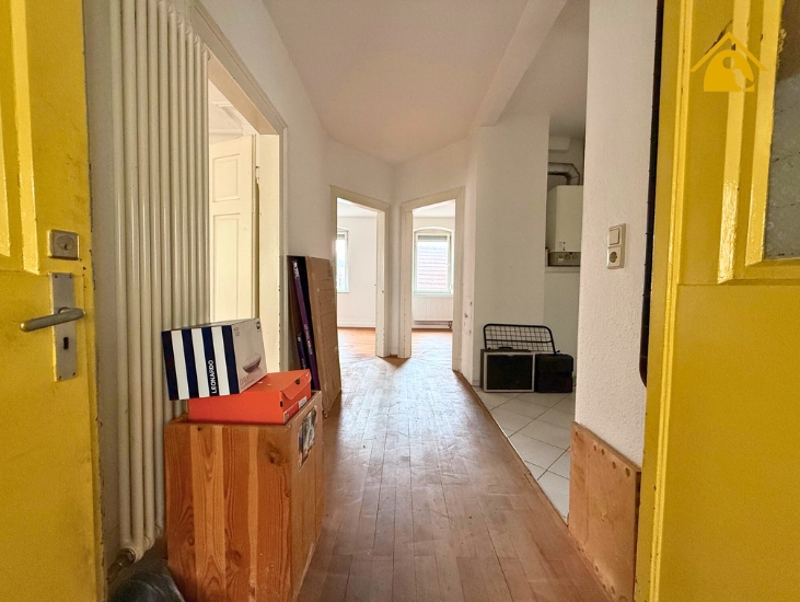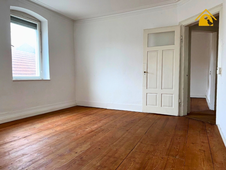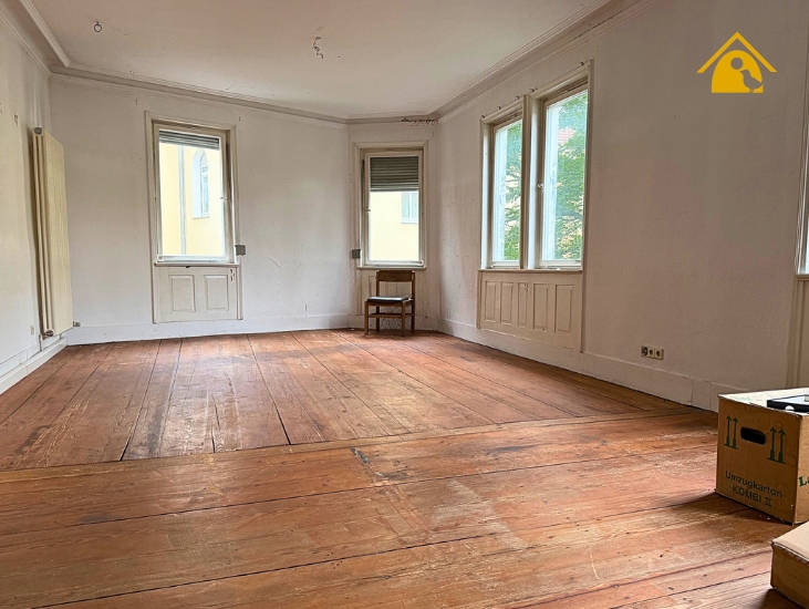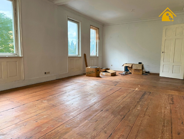 - Wohnung 1 (1. Obergeschoss): Ca. 104 m² Wohnfläche, sofort bezugsfrei. Sie besticht durch ihren authentischen Altbau-Charakter. Neben den verwinkelten Räumen sind es vor allem die originalen Holzdielen unter dem Bodenbelag, die hohen Decken und die breiten Fensterbänke, die der Wohnung eine einzigartige Atmosphäre verleihen. Das Badezimmer ist bereits modern gefliest.