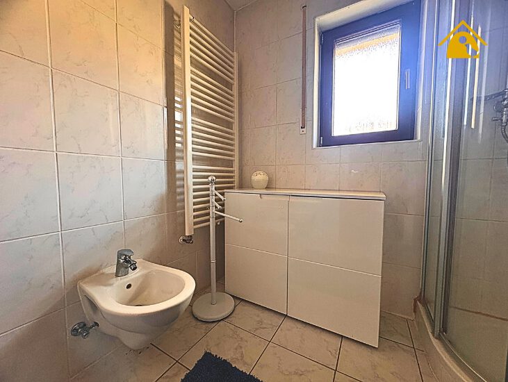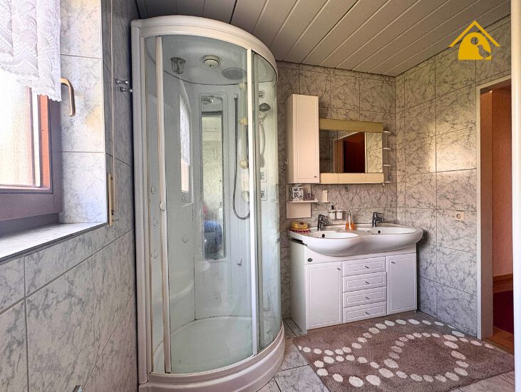 - Tageslichtbad mit Eckdusche, zwei Waschbecken, Bidet und Toilette