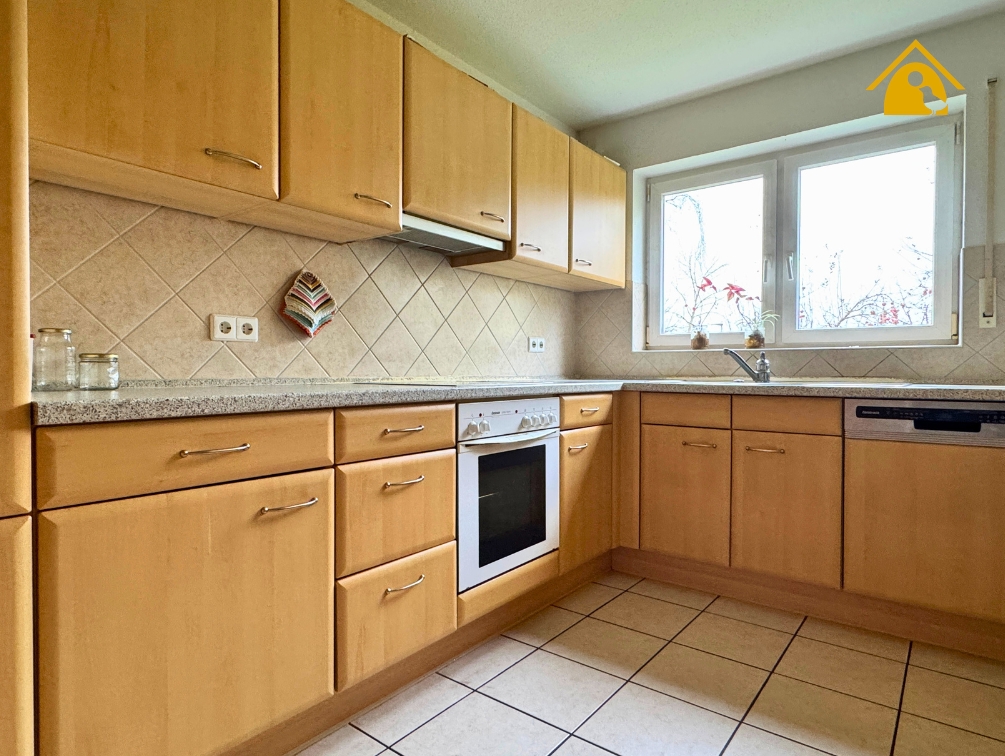 - Separate Küche mit U-förmiger Einbauküche, hellen Holzfronten und dunkler Arbeitsplatte.