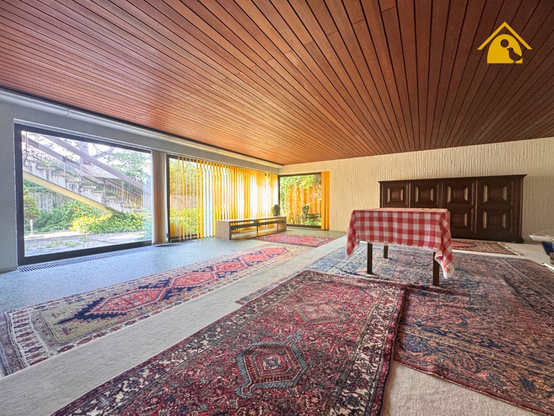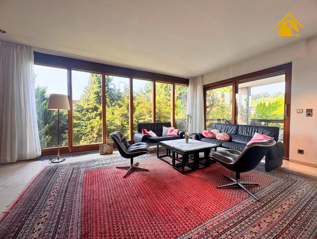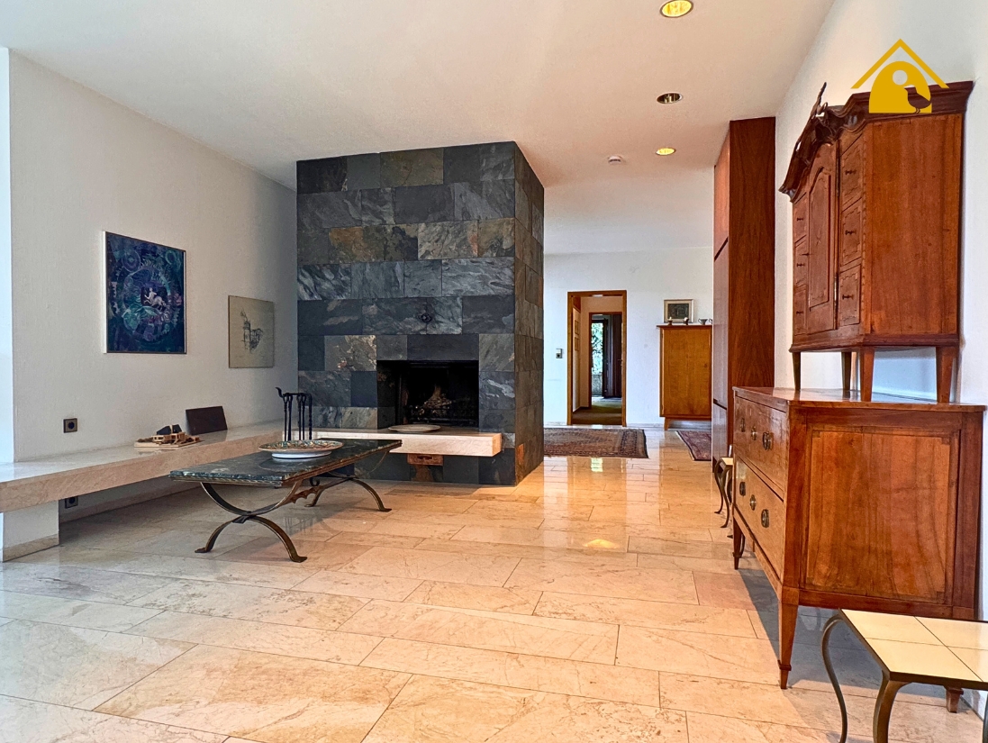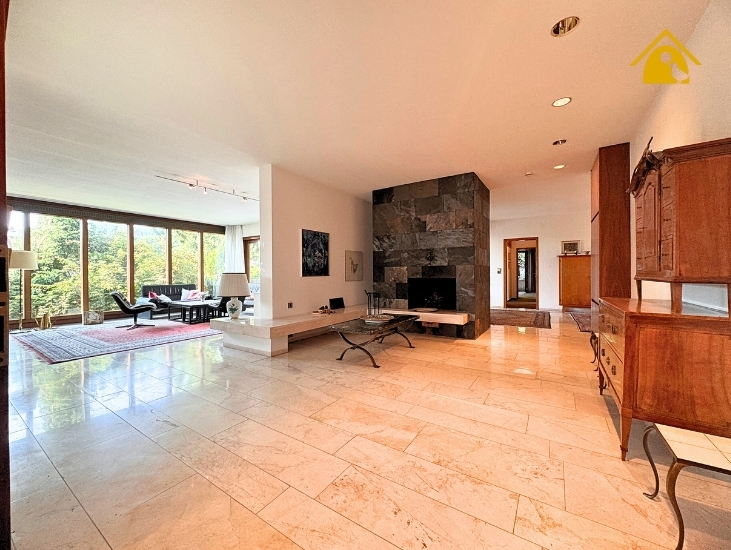 - Großes Wohnzimmer mit hochwertigen Fliesen und Zugang zur großen Südterrasse mit Natursteinboden & herrlichem Blick