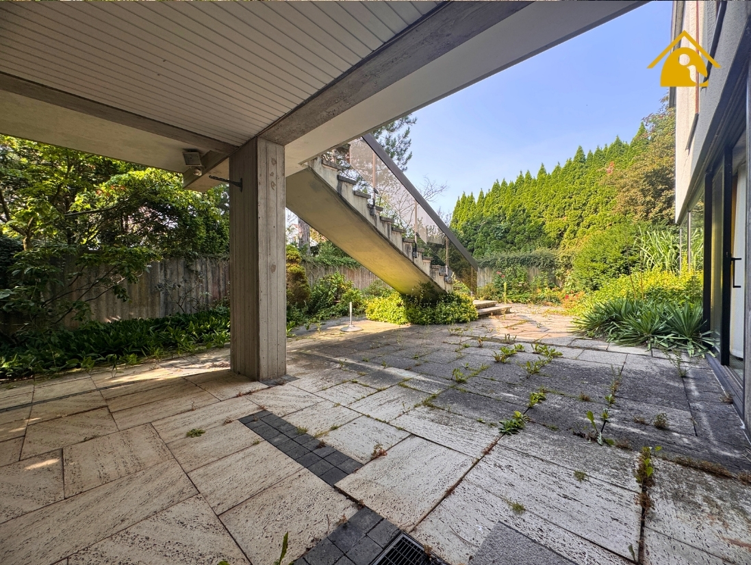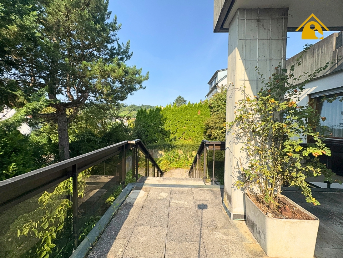 - Eine Außentreppe verbindet die große Terrasse mit dem Gartenhof im Untergeschoss