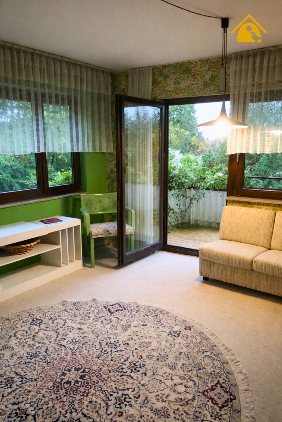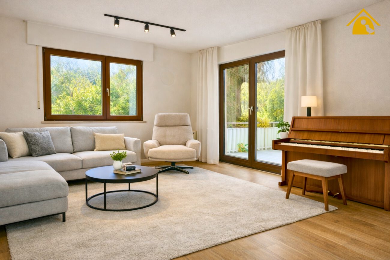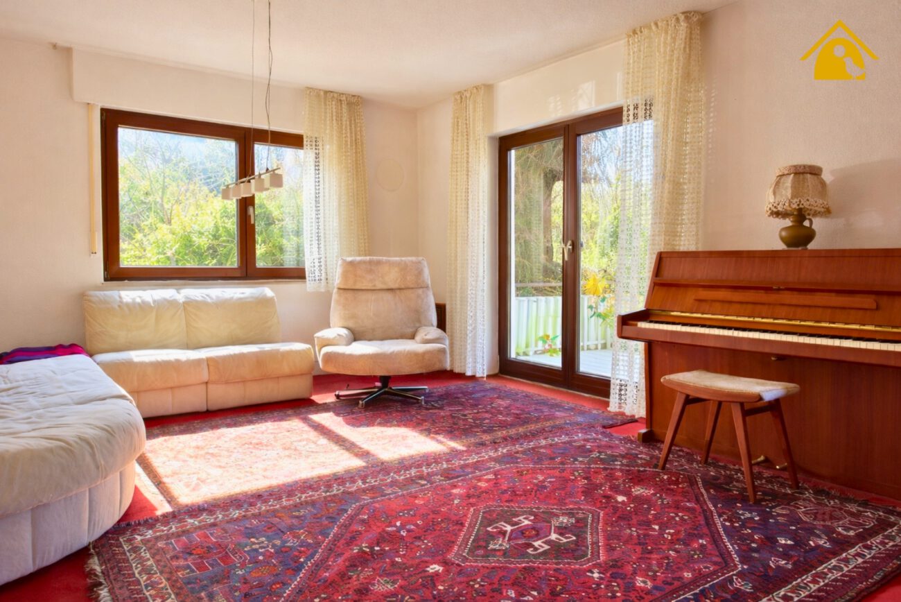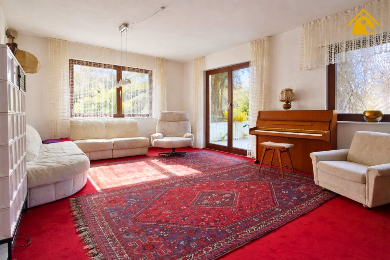 - Großzügiges, lichtdurchflutetes Wohnzimmer mit direktem Zugang zum großen überdachten Balkon und Treppe in den Garten