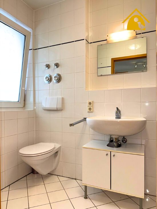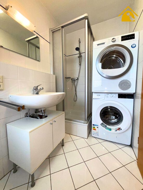 - Badezimmer mit Dusche, WC, Waschbecken sowie Waschmaschine & Trockner