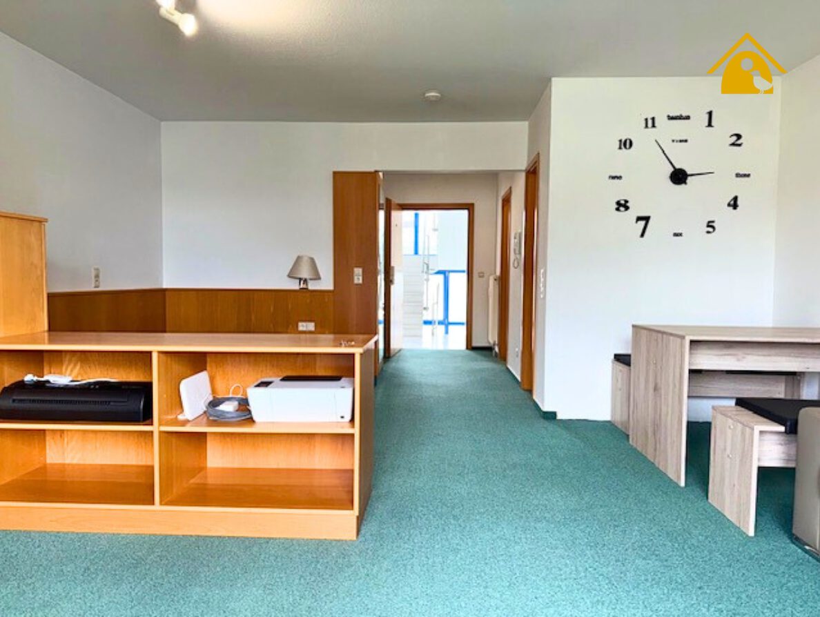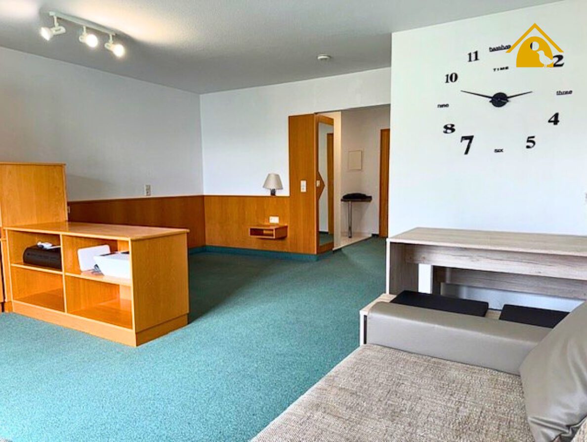 - Voll möbliert: Couch, Esstisch mit zwei Bänken, Regale, Wanduhr (ein Bett ist noch mitzubringen)