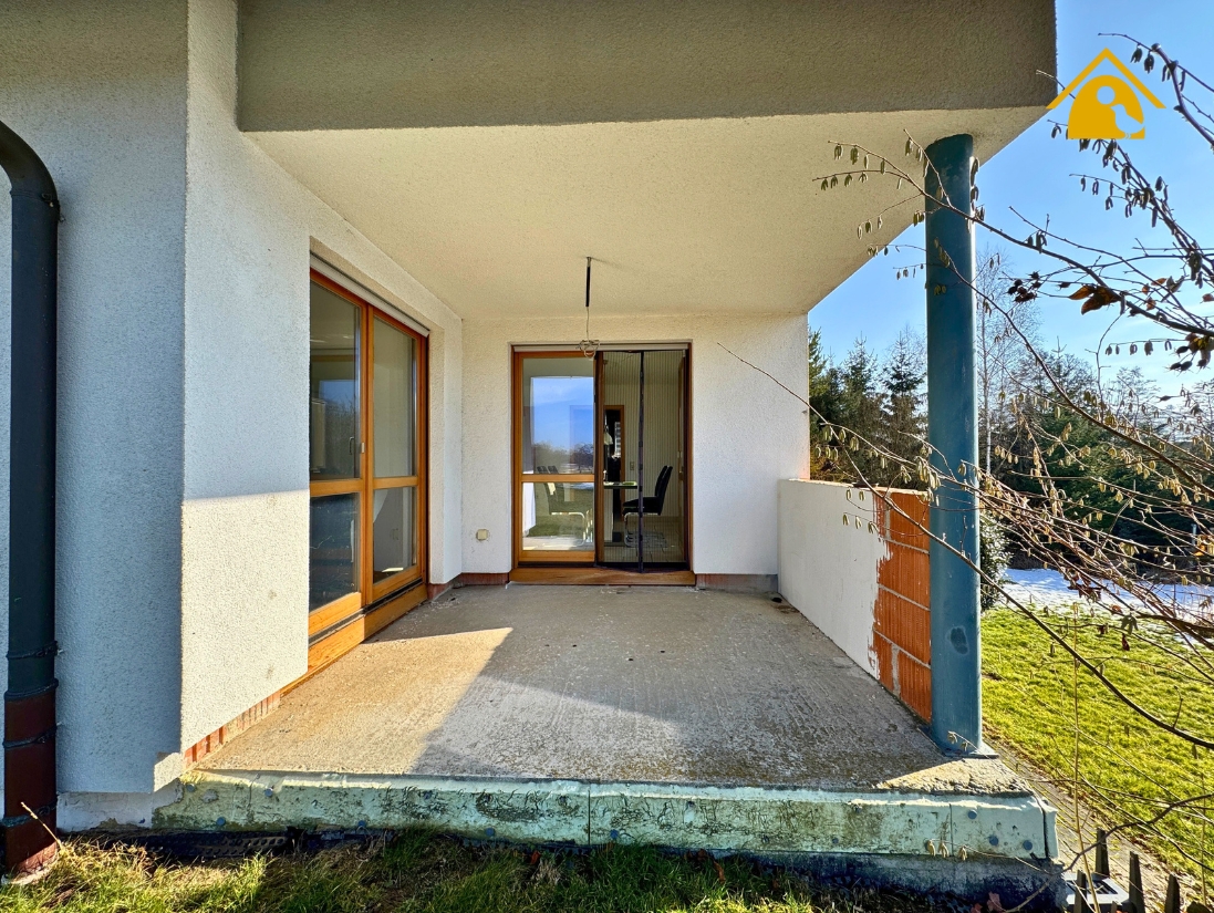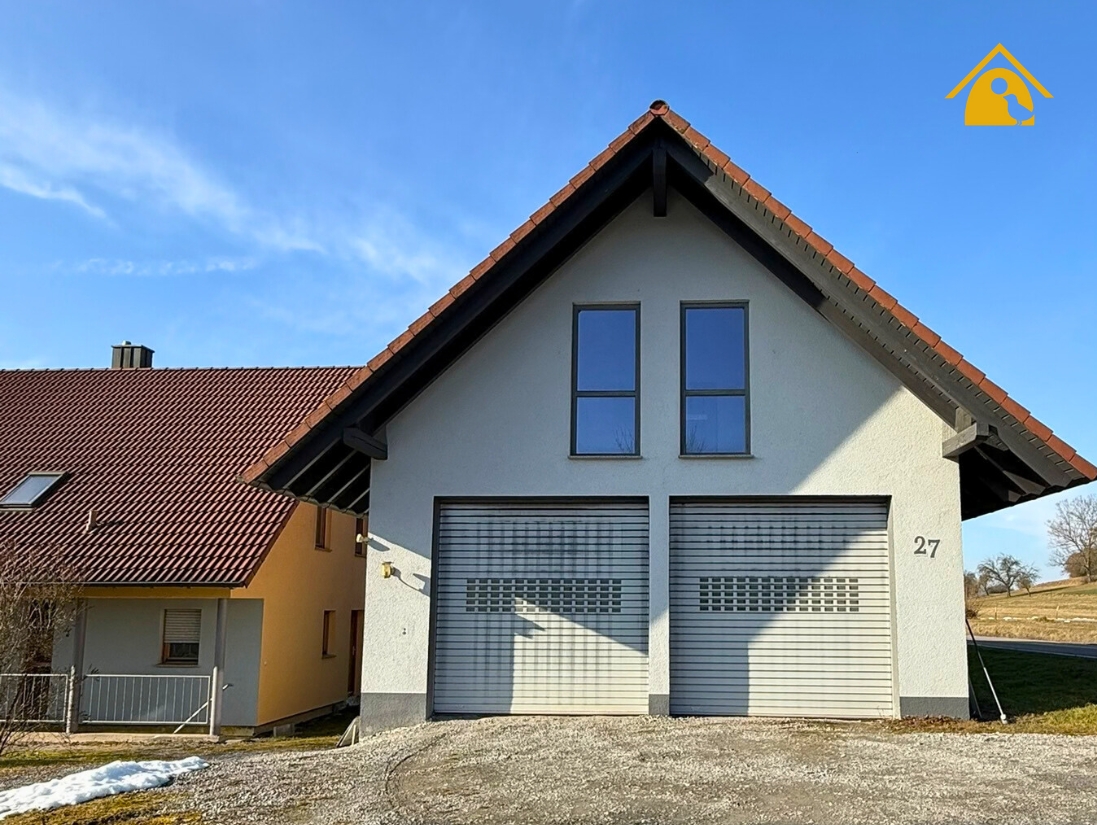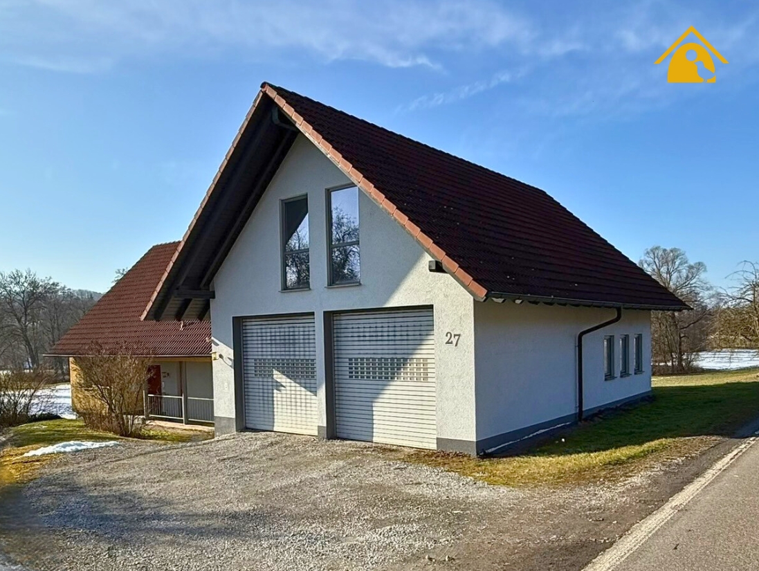 Das Wohnhaus präsentiert sich als Satteldachhaus mit gepflegter, warmer Fassade. Gauben im Dachgeschoss schaffen Licht und Raumhöhe, ein Balkon bietet einen Rückzugsort mit Fernsicht. Der überdachte Eingangsbereich mit hochwertiger Haustür empfängt Sie einladend, ein separater Nebeneingang ermöglicht eine klare Trennung von Wohnen und Arbeiten.
