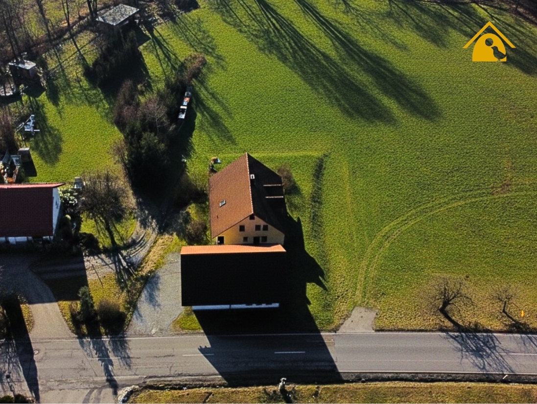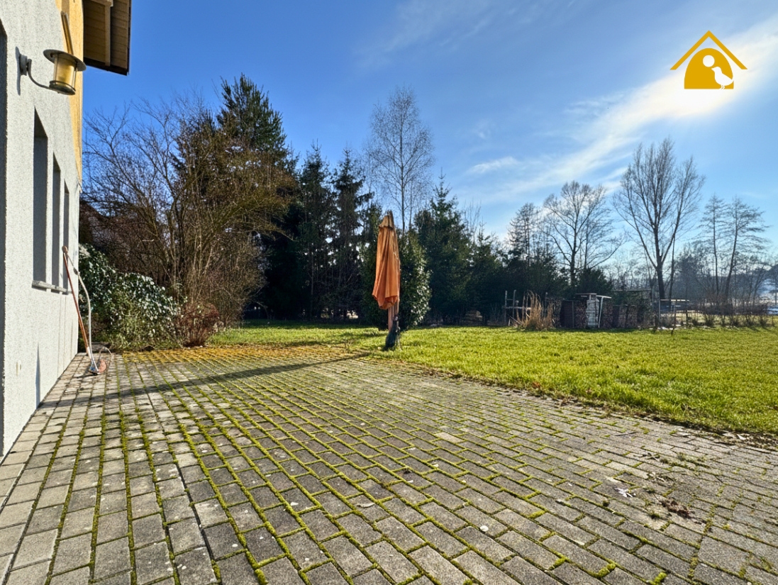 Hinter dem Haus öffnet sich eine großzügige Wiesenfläche mit viel Platz für Garten, Spiel und Erholung. Die Lage am Ende der Straße garantiert Ruhe, Weite und Privatsphäre – ein Gefühl von „Ankommen“.