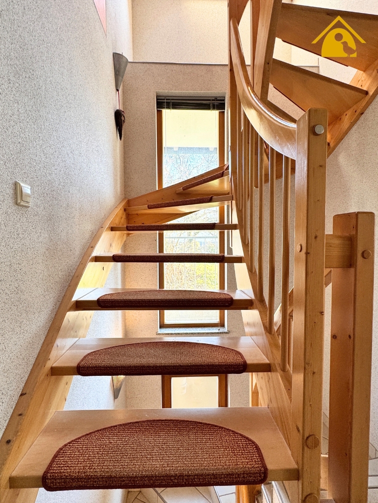 - Warm & wohnlich: Vom Erdgeschoss in den privaten Schlafbereich im Obergeschoss gelangt man über eine Holztreppe, die eine angenehme, wohnliche Atmosphäre schafft.